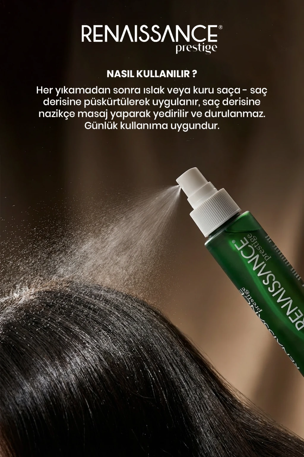 Her yıkamadan sonra ıslak veya kuru saçta, doğrudan saç derisine püskürtülerek uygulanır.