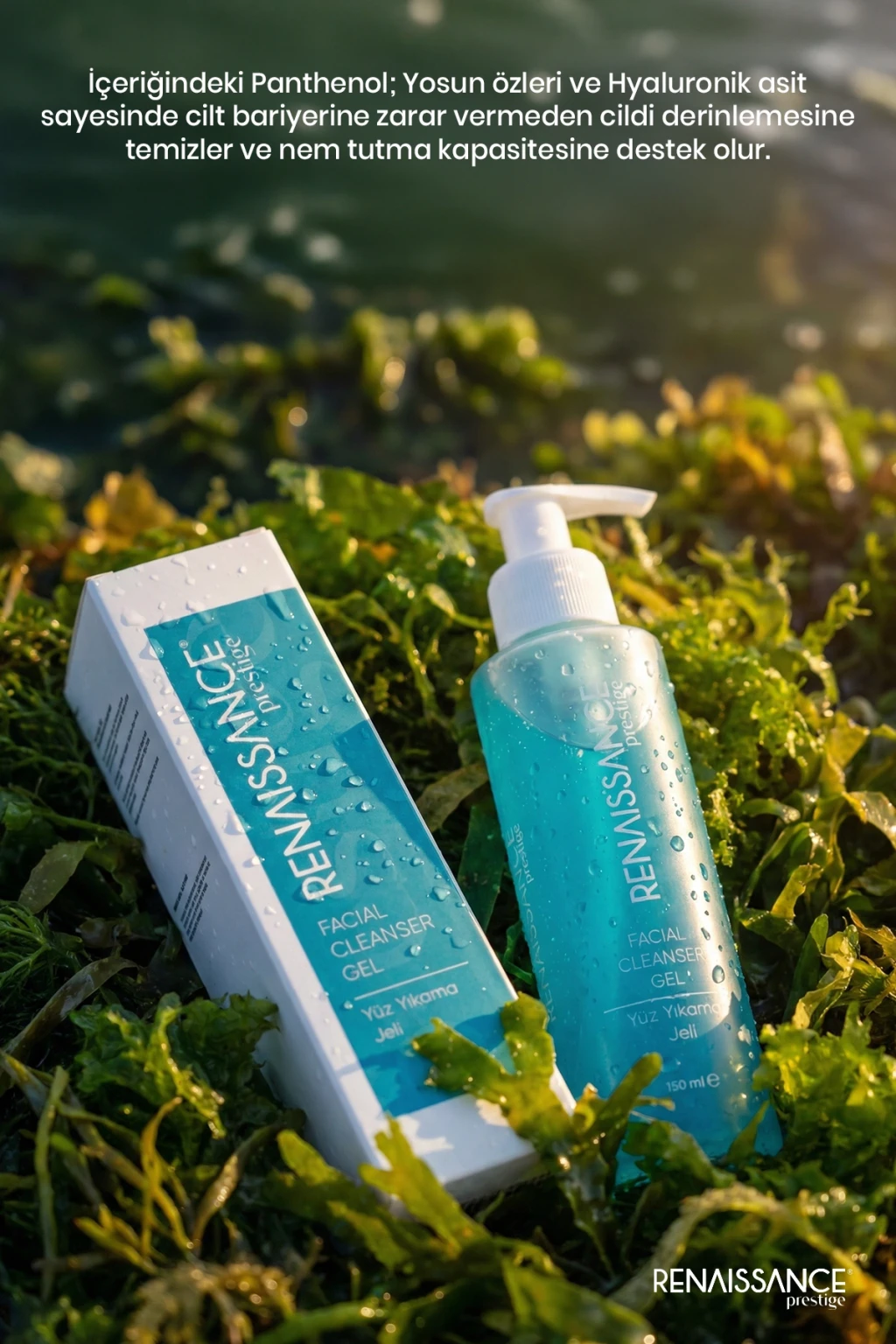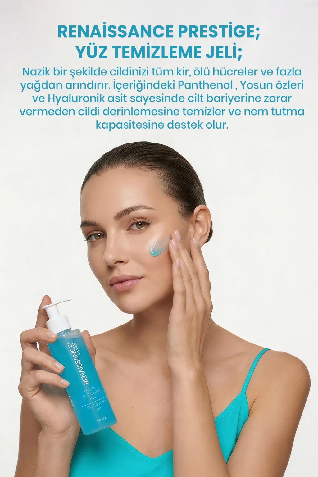 Renaissance Prestige Yüz Yıkama Jeli, cildinizi nazikçe temizler ve tüm kir, yağ ve ölü hücrelerden arındırır. İçeriğindeki Panthenol, Yosun Özleri ve Hyaluronik Asit ile cildinizin bariyerine zarar vermeden derinlemesine temizlik sağlar. Bu özel formül, cilt nem dengesini korur ve cildinize ışıltılı bir görünüm kazandırır. Yüzünüzü taze ve canlı tutmak için ideal bir ürün olan bu jel, düzenli kullanımda cilt bariyerine destek olur ve cilt dokusunu güçlendirir.